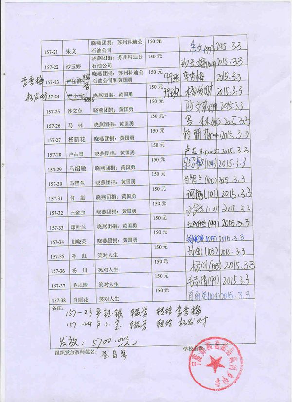 第157批战河中学(2015年3月到2015年8月)受助学生签收单