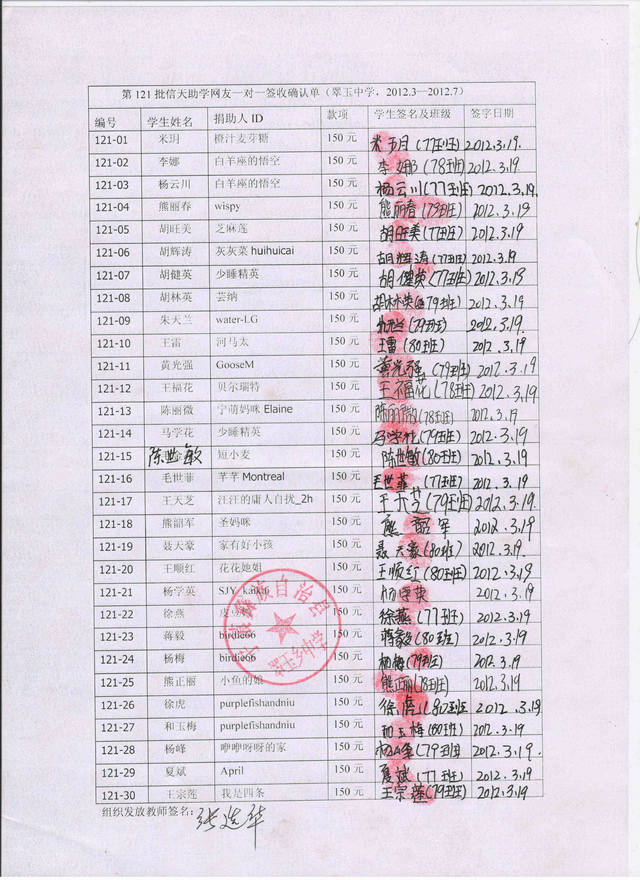 第121批翠玉中学2012.3-2012.7资助款发放签收确认单: