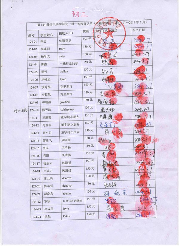 第124批蒗蕖中学(2014年3月--2014年7月)受助生资助款签收确认单: