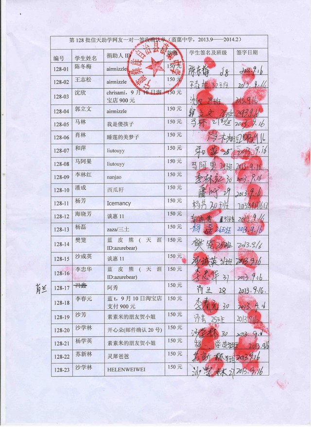 128-17冯鑫,因转学到金棉中学,资助转给肖兰;
