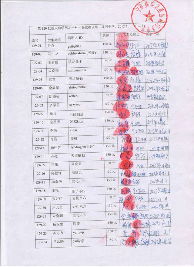 第129批战河中学(2012年3月--2012年7月)受助生资助款签收确认单
