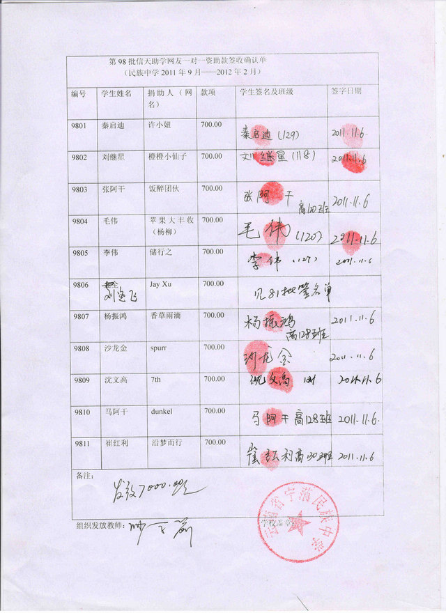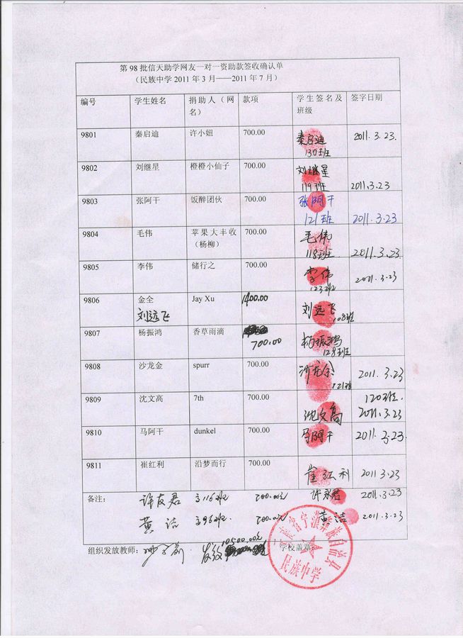 民族中学98批(2011年3月-2011年7月)信天助学款发放签名表
