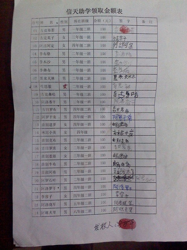 三河口中心校140批受助学生签收单