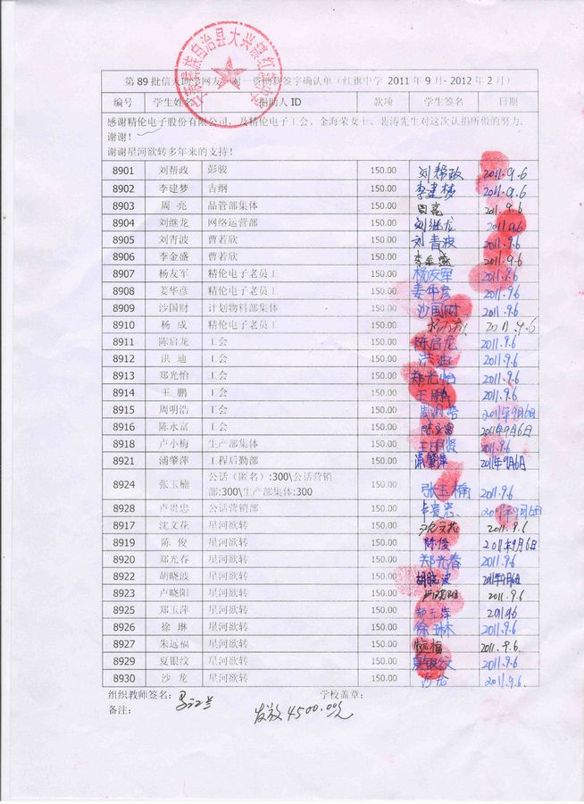 红旗乡中学89批(2011年9月-2012年2月)信天助学款发放签名表
