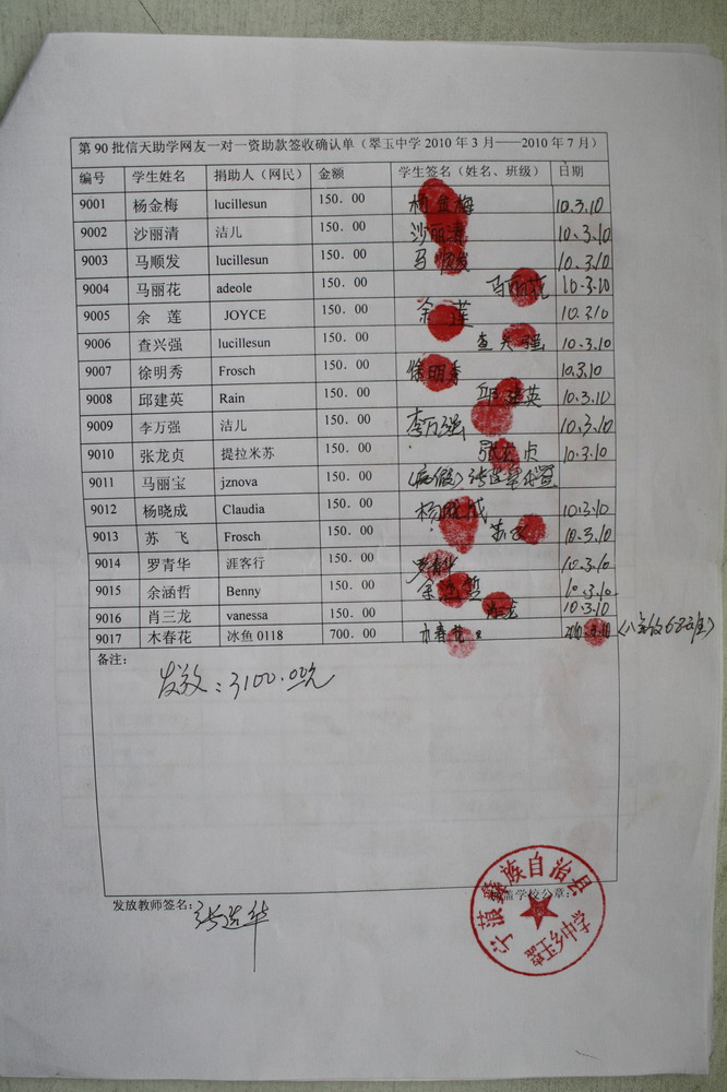 翠玉中学90批(2010年3月-2010年7月)受助学生签收确认单