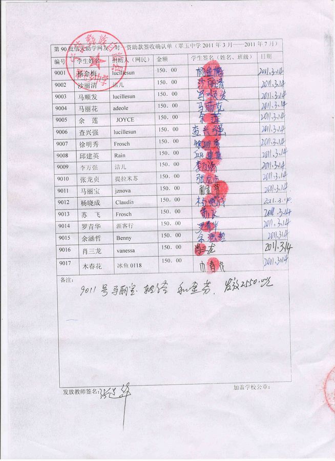 翠玉中学90批(2011年3月-2011年7月)受助学生签收确认单