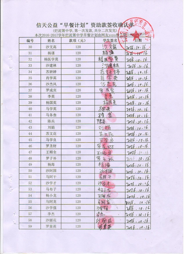 烂泥箐中学,2016-2017年早餐计划第一次发款签收单