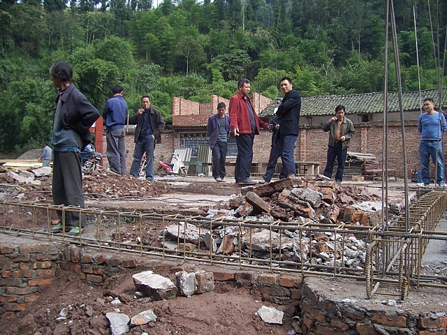 : [教师们观看施工现场]