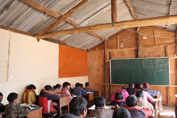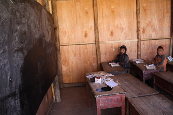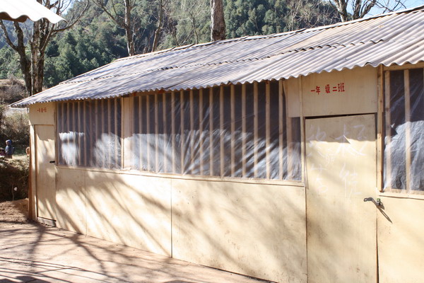 原来的简易教室由于漏雨,三合板太薄,已经拆了,现在在老学校外面空地上用厚木板加固了新的简易教室。
