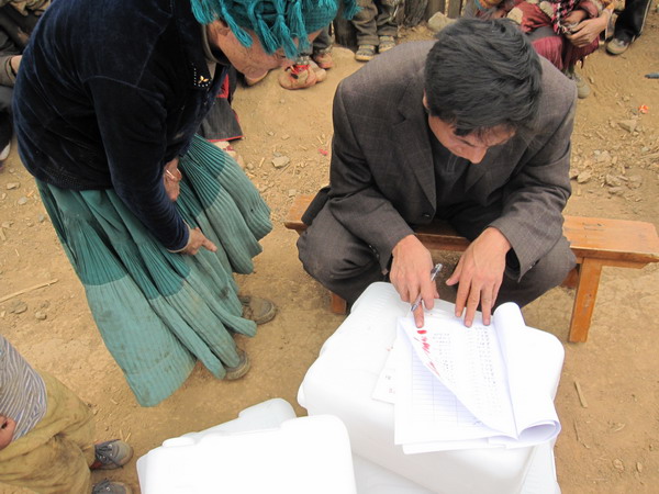 村长在记录,村民们大都不识字,由村长签字,村民们按手印。。