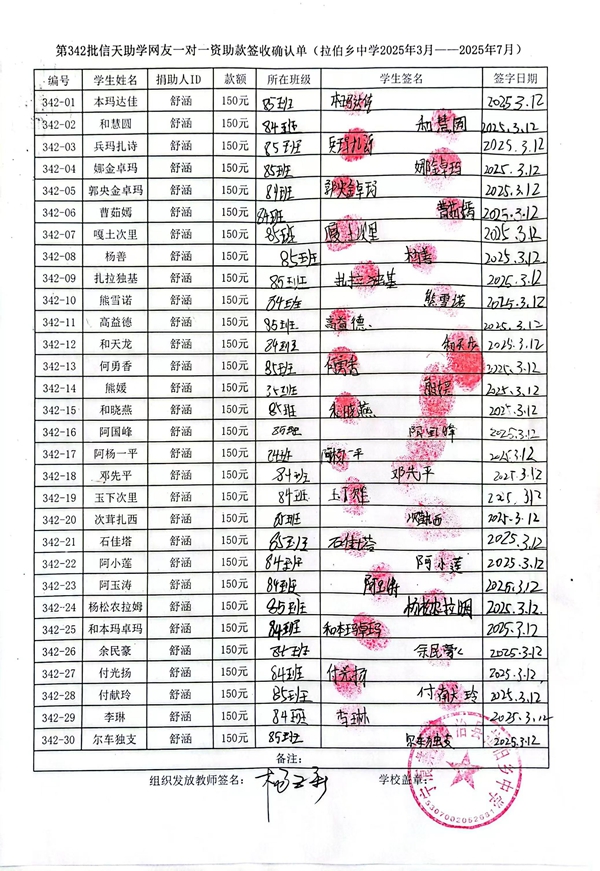 第342批拉伯中学(2025年3月-2025年7月)受助学生签收单