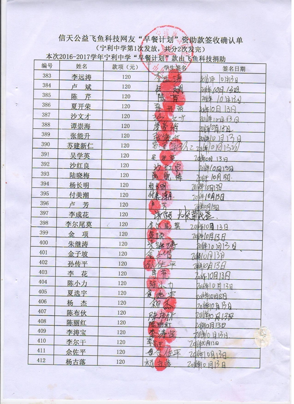 宁利中学,2016-2017年早餐计划第一次发款签收单