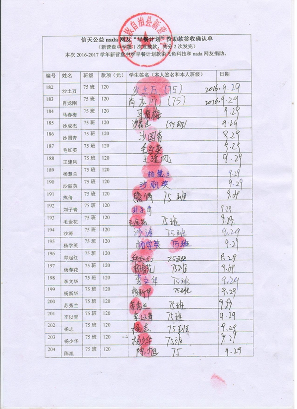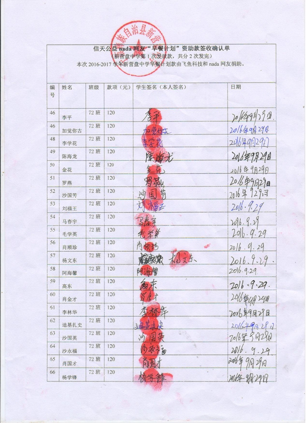 新营盘中学,2016-2017年早餐计划第一次发款签收单