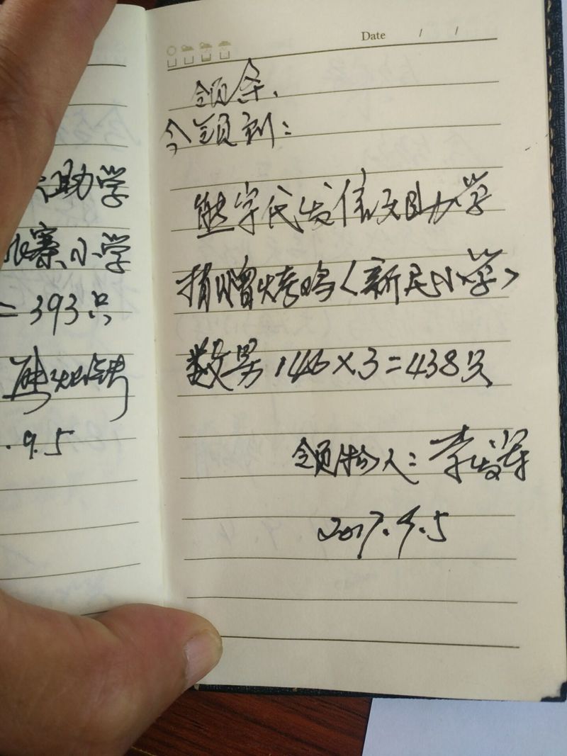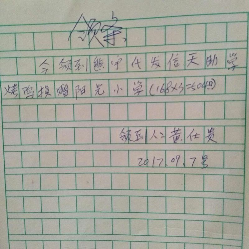 (1)贵州毕节大方县、纳雍县山村小学,熊宇代为接收分发。