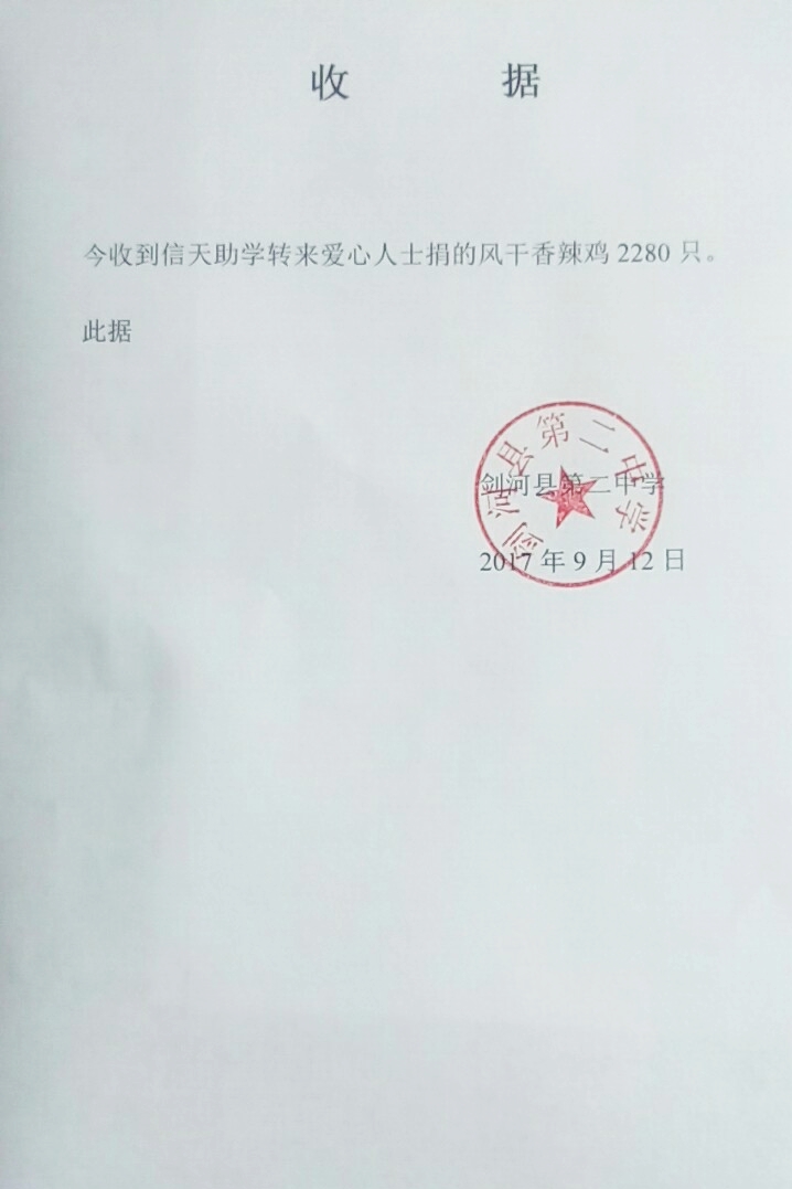 通过您寄过来的风干香辣鸡大袋46袋,小袋1840袋已收到,并发放到了袁家溪小学全部学生、全体教职员工手中。