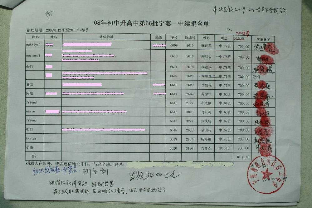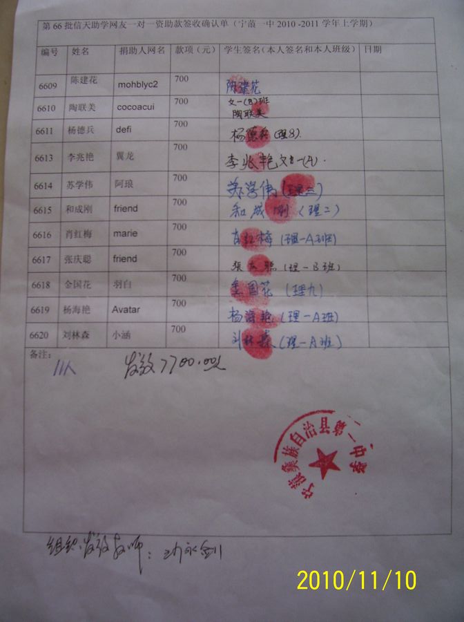 宁蒗一中66批(2010.9-2011.2)受助学生签字确认单