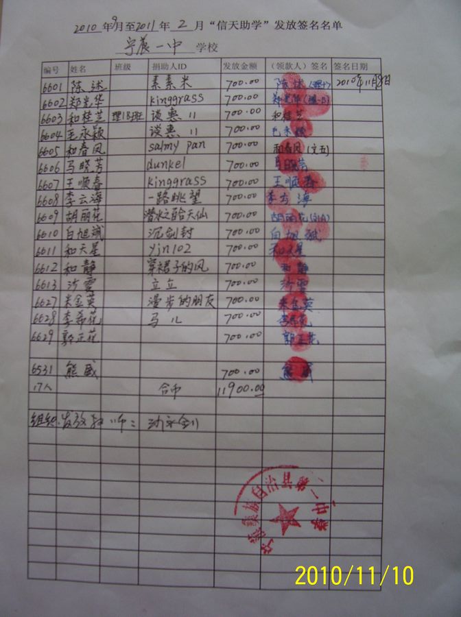 编号 受助生姓名 初中时期编号 资助人 2010年款项汇入时间 汇入金额