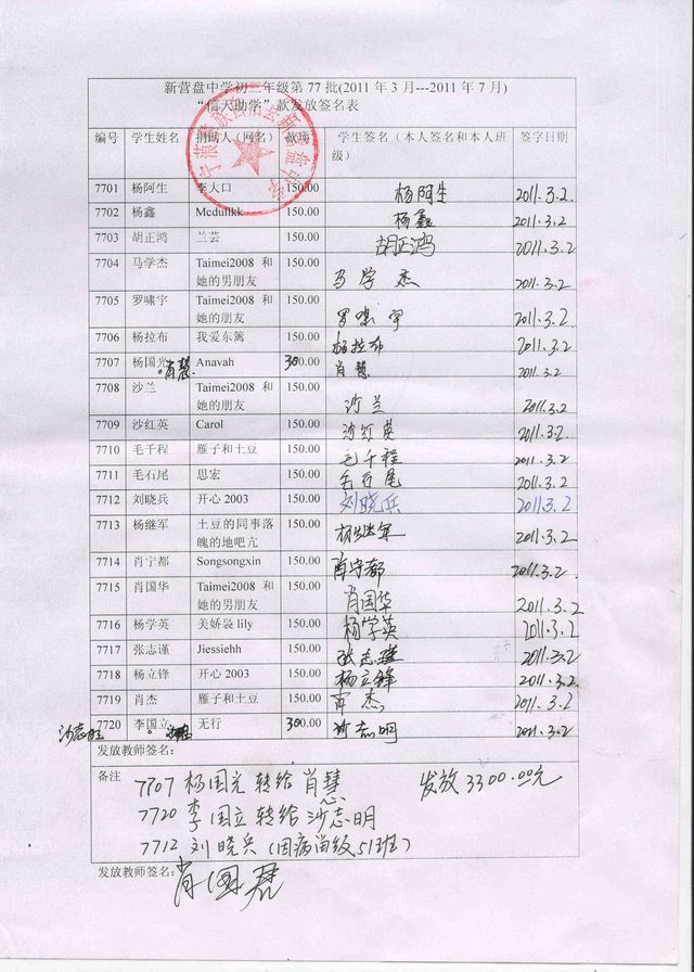 新营盘中学77批(2011年3月-2011年7月)受助学生签收确认单