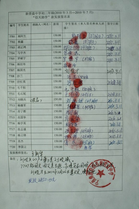 新营盘中学77批(2010年3月-2010年7月)受助学生签收确认单
