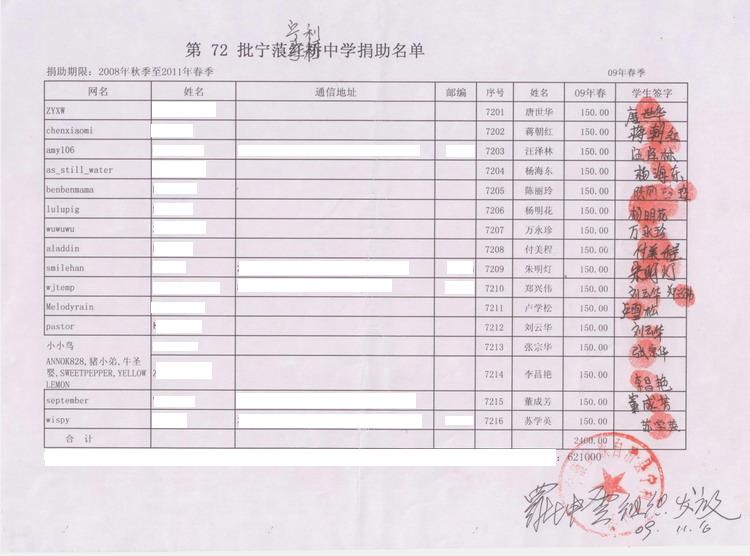标题: 第72批受助生认捐名单(08年宁利中学初一16名,本帖为备份è´