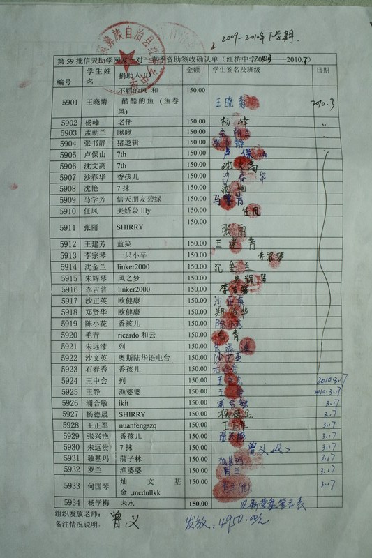 红桥中学59批(2010年3月到2010年7月)受助学生签收单: