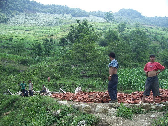 二坪中心校到了,他们要从这里步行上山了。这里堆放着准备运上山的砖块和沙子
