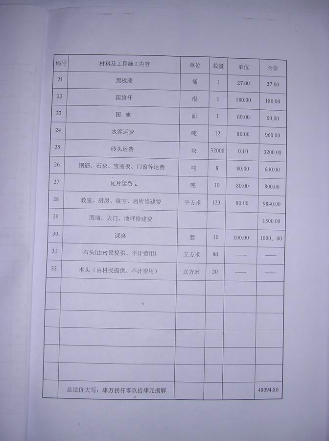I have good news for you: the construction of Wa Yu School has been finished. The total cost is ¥48094.80, and I will send the final financial statement and other documents to Miss Tang and you as soon as possible. Since Miss Tang has already sent me ¥30000, the residual balance will be ¥18094.80. Could she remit me the left money at her earliest convenience?