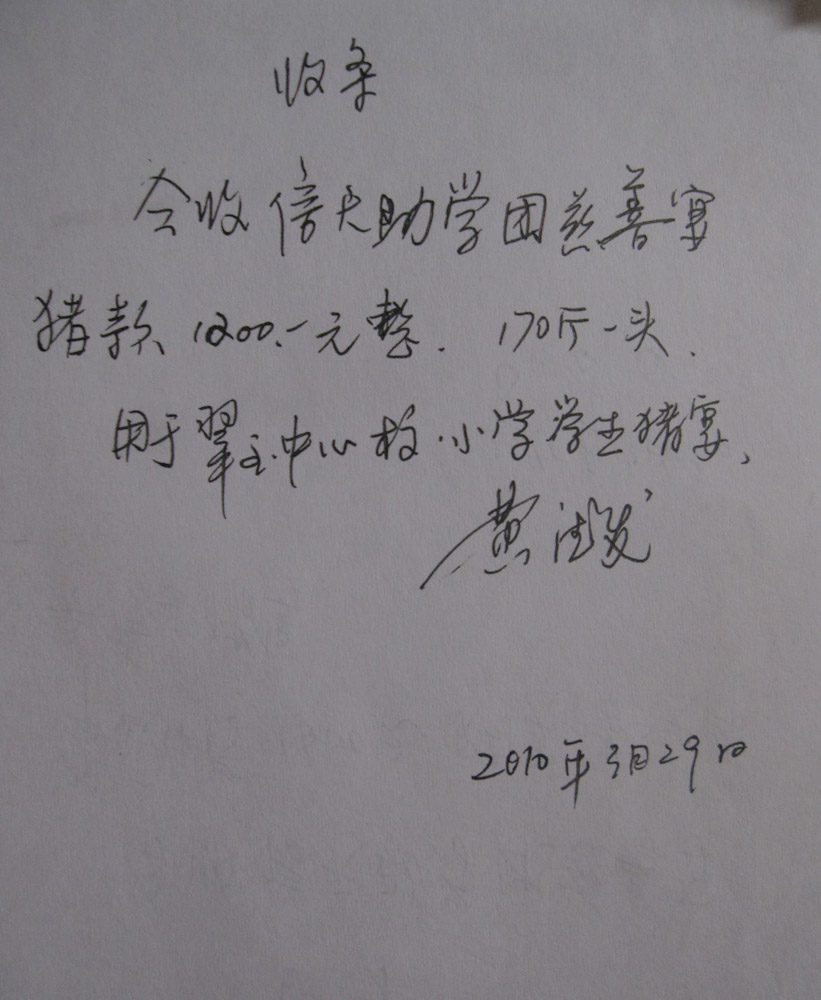2)2010年3月底,已筹集到16头猪款,信天于3月底把15头猪款计24000元汇给当地负责人浦理智老师,他也是我们一对一助学的当地总负责人。