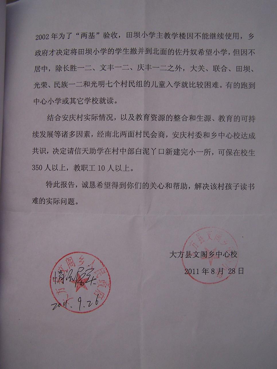 当地中心校希望信天助学帮助修建学校的报告