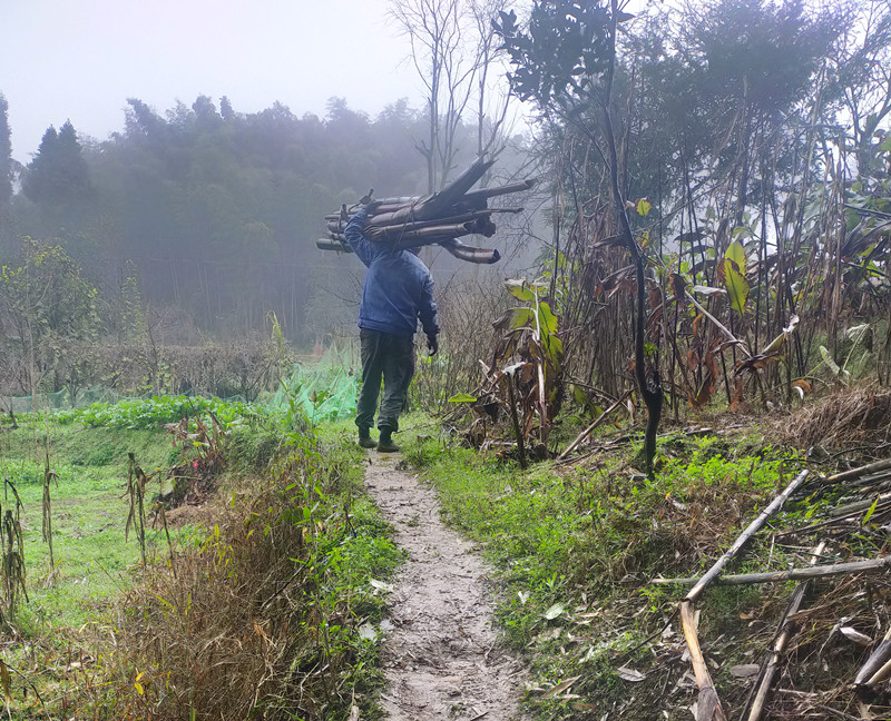 村民劳动,修好路之后,就不用肩扛背驮了,可以用四轮车运输了。