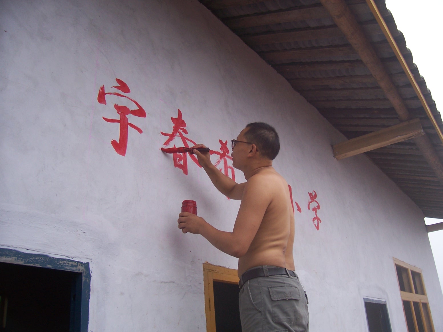 民主乡的“书法家”,教师志愿者彭老师为学校题写校名