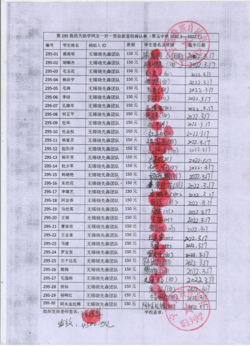 第295批翠玉中学(2022年3月-2022年7月)受助学生签字确认单