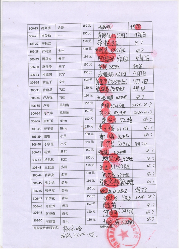 第306批小凉山学校初一(2021年3月到2021年8月)受助学生签收单