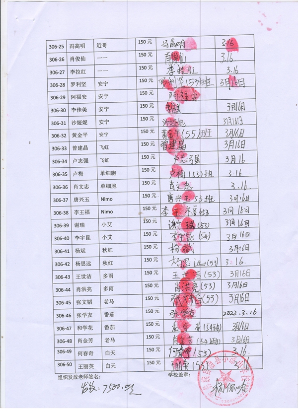 第306批小凉山学校(2022年3月到2022年7月)受助学生签收单