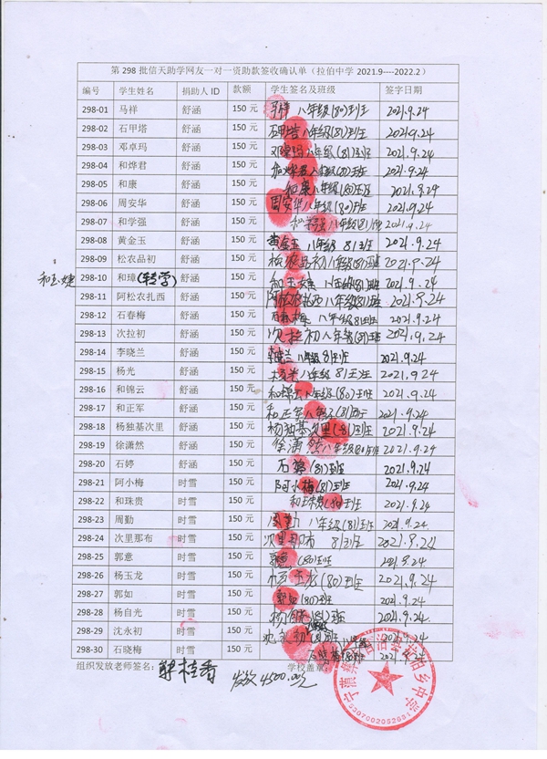 标题: 第298批受助学生名单(拉伯中学初一30名,舒涵20,时雪10)