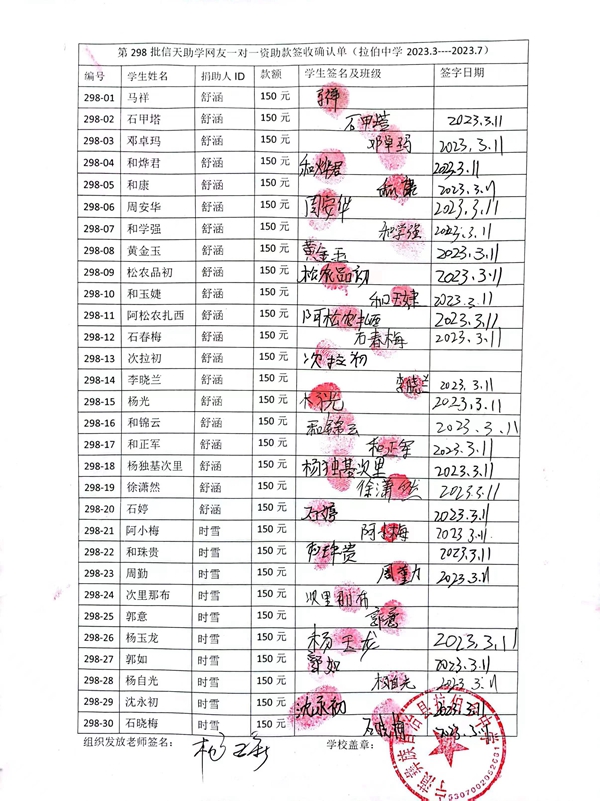 第298批拉伯中学(2023年3月-2023年7月)受助学生签收单