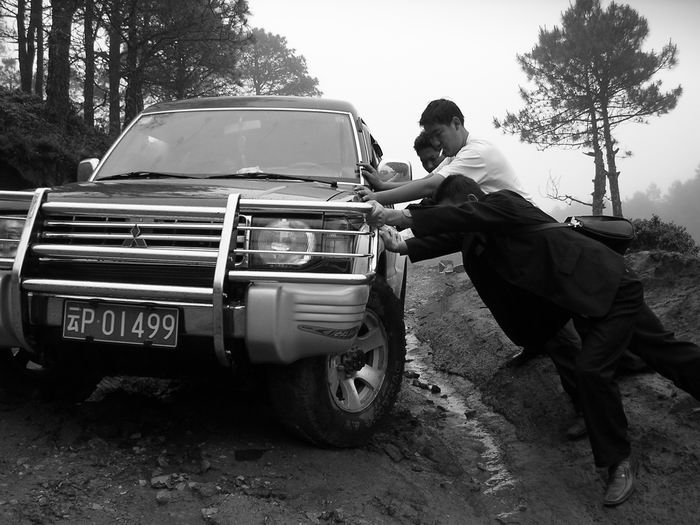 036-2004年5月底永公亩考察途中,车陷入泥地中,众人齐力推车.jpg