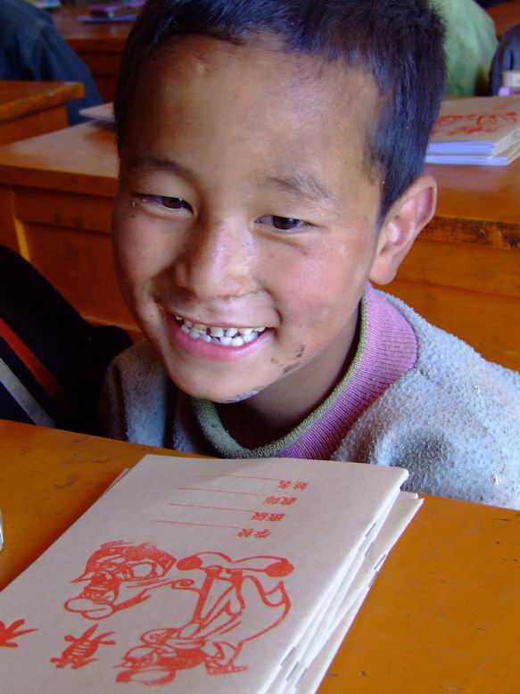 一段震得人快散架的山路之后,而在没有任何心理准备的时候,车停在了村小门口,一群可爱的孩子出现在我们面前,此次的我已无法控制自己的眼泪,因为孩子们比我想像中的更瘦更黑。孩子们看到我们的到来无比的高兴,纷纷排好队进入教室。我也调整了自己的情绪,进入教室之后,看到狭小的空间里放满了课桌椅(由于只有一位老师,所以所有的学生都在一起上课),只有老师可走动的空间,更谈不上是否有讲台。接下来我和老师为孩子们分发文具、课外读物和糖果,此时孩子们都露出了欢喜的笑容,把文具排排放,我的心中也感到了一丝欣慰,也许这是带给孩子们最好的礼物了。当老师给二年级的学生戴红领巾时,他们都显得无比的兴奋和高兴,本来灰灰的教室里,有了红领巾之后变得明亮起来。在给孩子们拍照的过程中,发现由于缺水的原因,孩子们的脸上和手上都是黑黑的一层污垢,衣服都是灰灰的,满屋子的苍蝇叮在他们的身上。