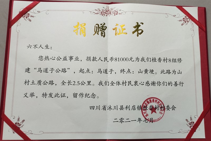 捐赠证书。