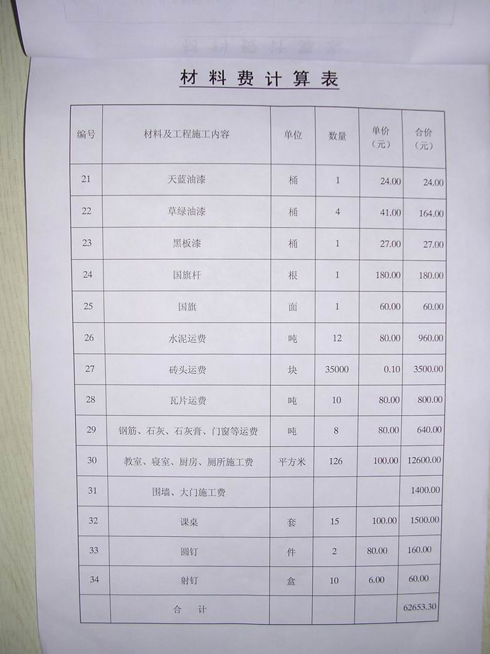 30)                教室、寝室、厨房、厕所修建施工費        126平方*100元/平方        12600.00