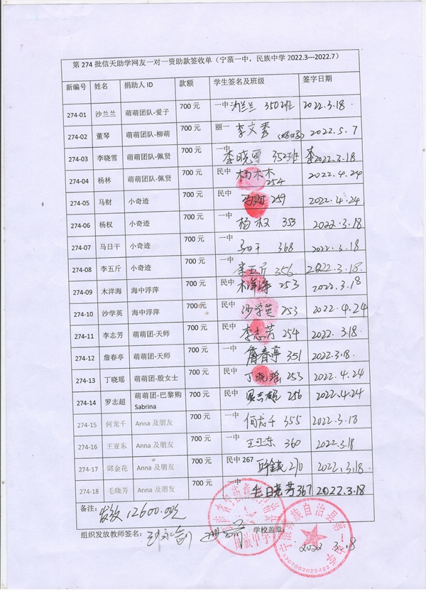 第274批高中续捐(2022年3月-2022年7月)受助学生签收单