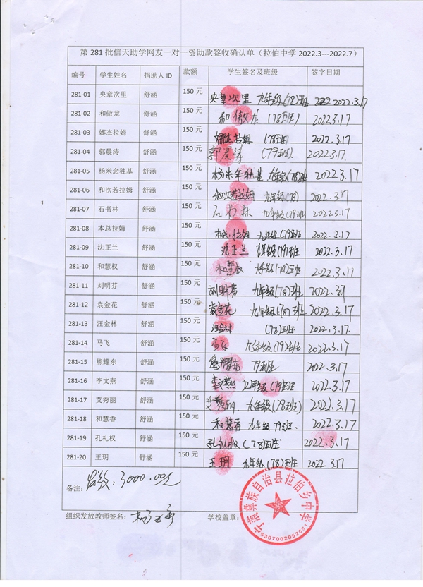 第281批拉伯中学(2022年3月-2022年7月)受助学生签字确认单