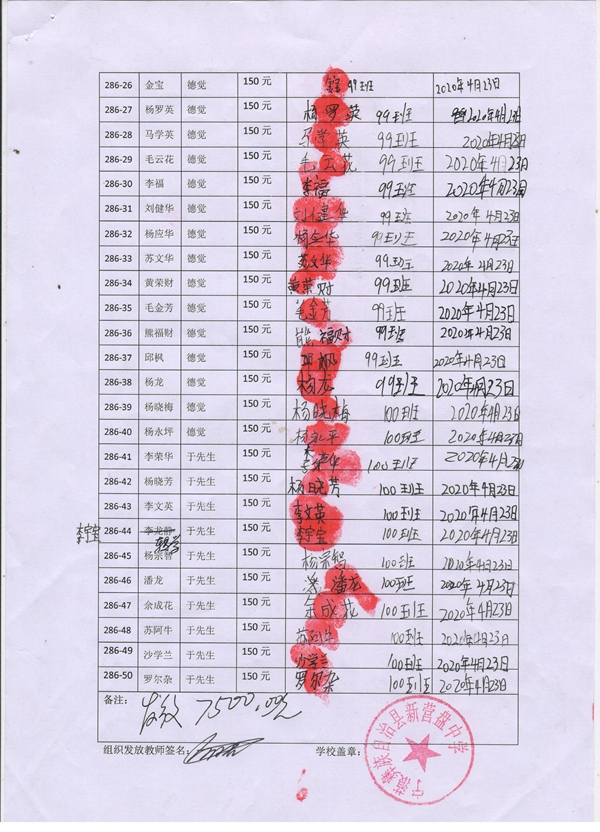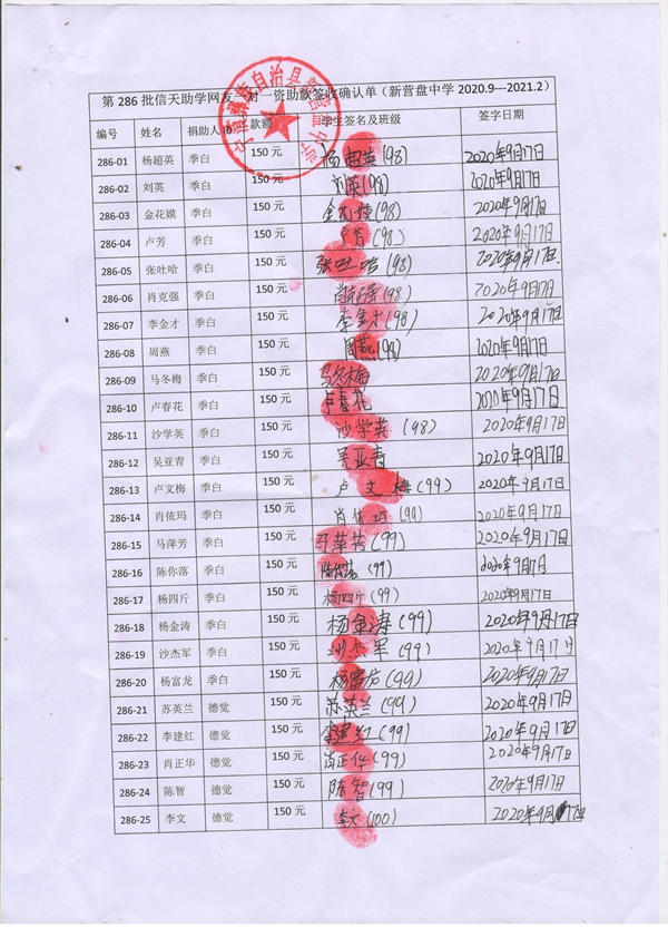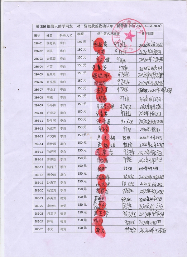 第286批新营盘中学(2020年2月到2020年8月)受助学生签收单