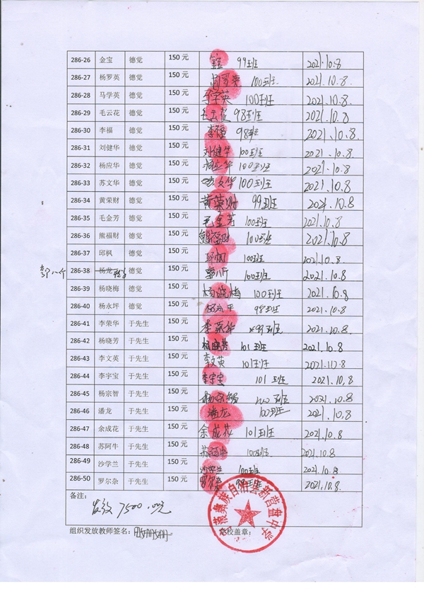 第286批新营盘中学(2021年3月到2021年8月)受助学生签收单