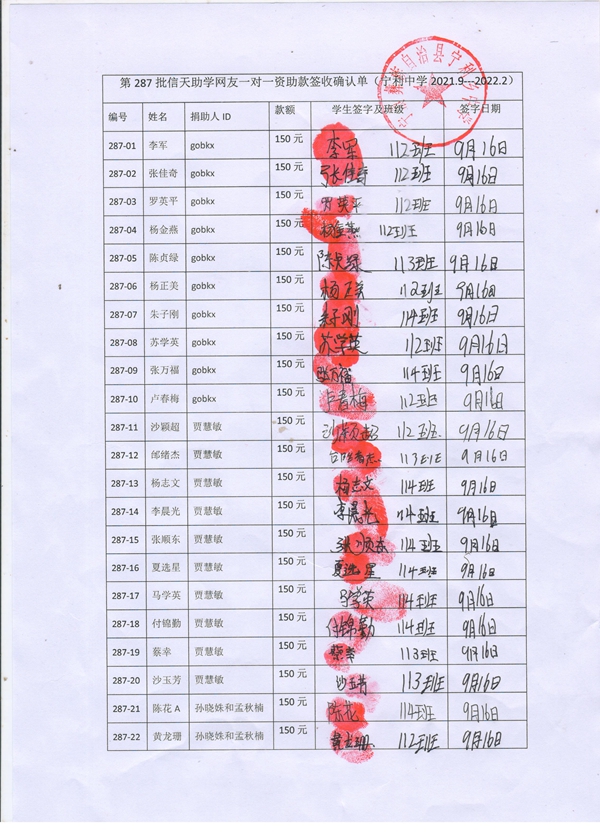 第287批宁利中学(2021年9月到2022年2月)受助学生签收单