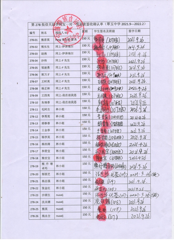 第278批翠玉中学(2021年9月-2022年2月)受助学生签字确认单