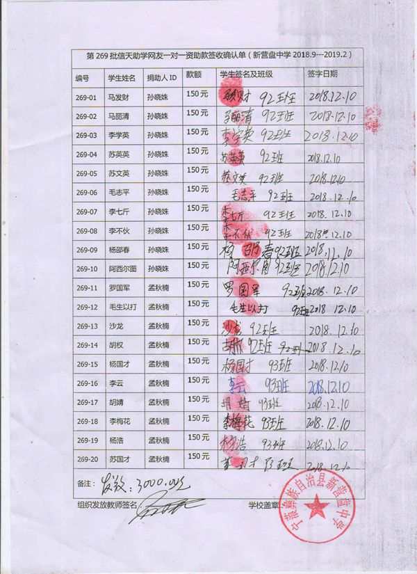 第269批新营盘中学(2018年9月-2019年2月)受助学生签收单