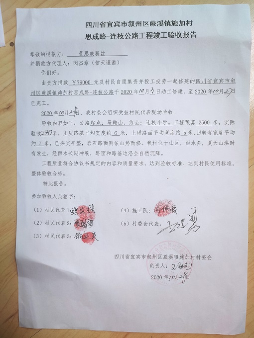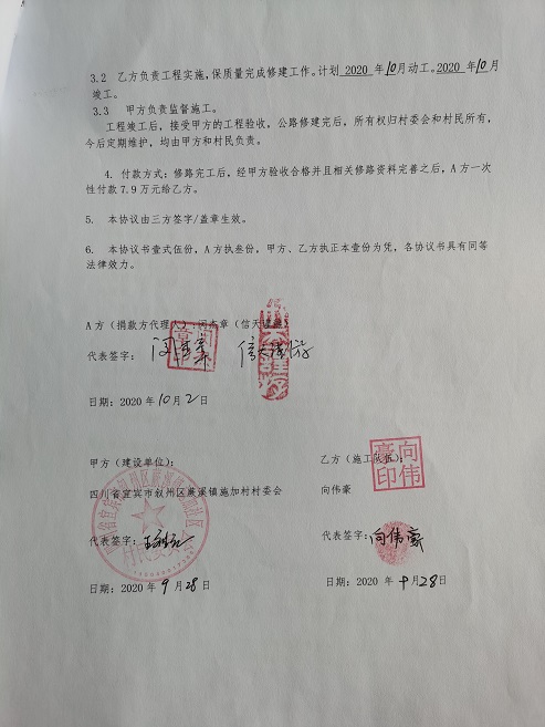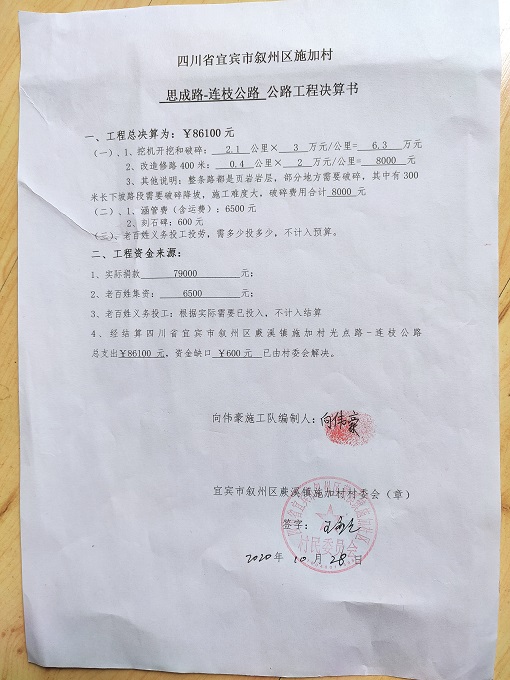 (5)修路预算分好几部分,有挖掘机、涵管、炸药爆破(山崖需要爆破)或者岩石破碎、堡坎、村民义务工、征地等。修路,捐款方不全包,捐款方出一大部分钱:挖掘费用、部分山崖爆破(如有的话)或破碎等。村民出义务工、涵管、征地费、或部分破碎费用,村民小额集资。