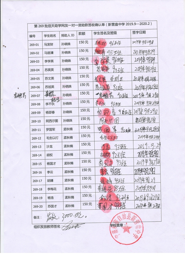 第269批新营盘中学(2019年9月到2020年2月)受助学生签收单