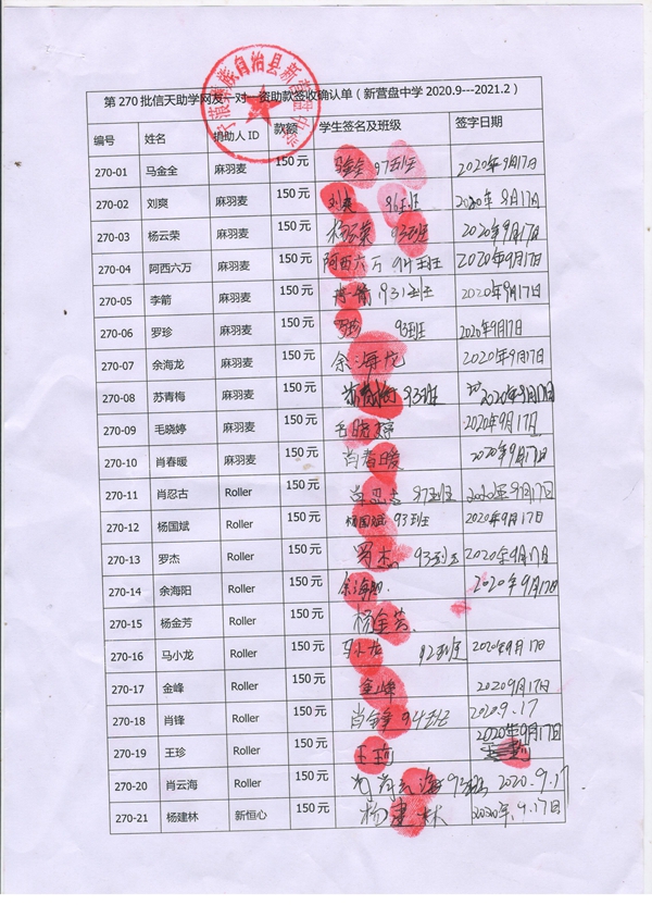 第270批新营盘中学(2020年9月到2021年2月)受助学生签收